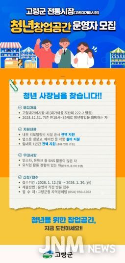 제이앤엠뉴스 | 고령군은 이달 말 30일까지 고령대가야시장 내 청년창업공간에 신규 점포를 운영할 만19~39세 청년 창업가를 모집한다고 밝혔다.