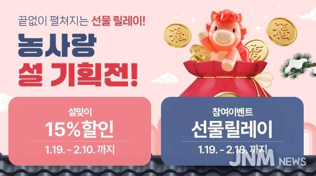 제이앤엠뉴스 | 충남도 대표 농특산물 온라인 쇼핑몰 충남농사랑이 한 해의 시작을 알리는 설 명절을 맞아 도내 농특산물의 소비 촉진, 지역 농가의 소득 증대와 함께 도민의 합리적이고 건강한 소비를 위해 19일부터 2월 10일까지 설 명절 기획전을 진행한다.
