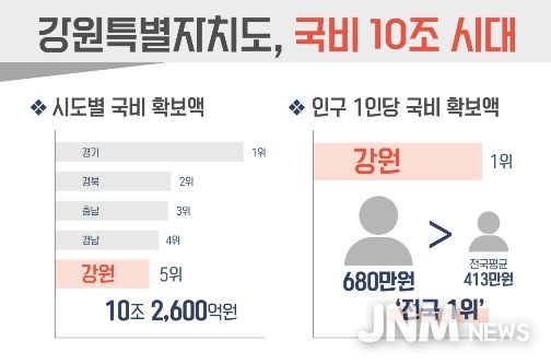 제이앤엠뉴스 | 강원특별자치도는 국비 확보 10조 시대에 진입한 가운데, 인구 1인당 국비 확보액이 약 680만 원으로 전국 1위에 해당한다고 밝혔다.