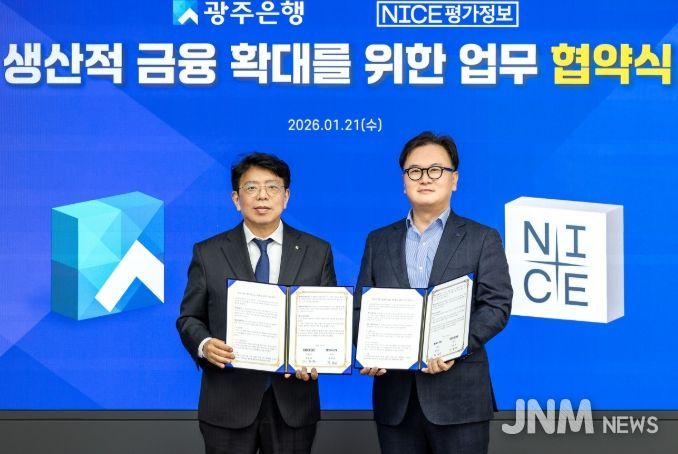 제이앤엠뉴스 | 광주은행은 21일, 광주은행 본점에서 NICE평가정보㈜와 지역 산업 경쟁력 강화를 위한 ESG 데이터 기반 ‘생산적 금융 확대 업무협약(MOU)’을 체결했다고 밝혔다.