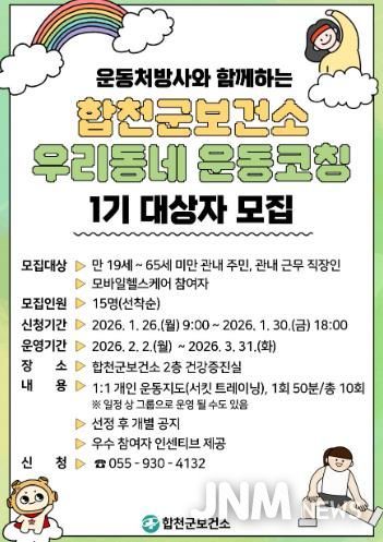 제이앤엠뉴스 | 합천군은 개인별 체력과 건강 상태를 고려한 맞춤형 운동 프로그램 '우리 동네 운동코칭 : PT with U'에 참여할 1기 대상자를 모집한다고 23일 밝혔다.