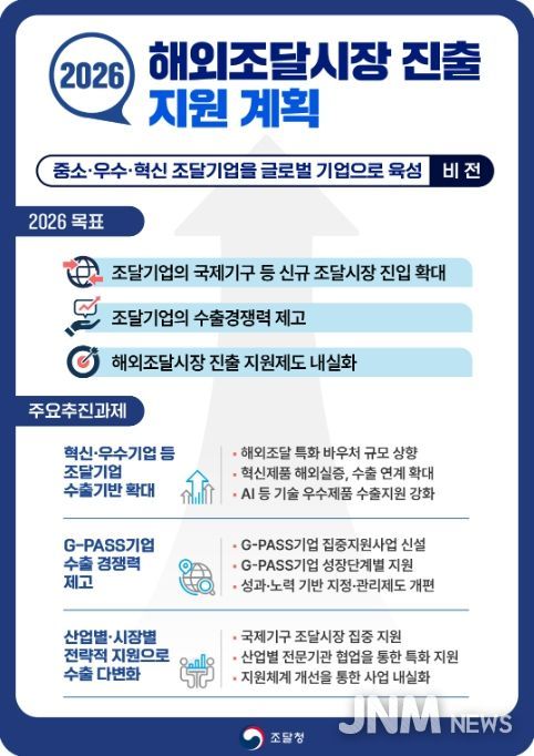 제이앤엠뉴스 | 조달청은 중소 혁신·기술우수 조달 기업들이 글로벌 기업으로 도약할 수 있도록 '2026년 해외조달시장 진출 지원계획'을 확정하여, 해외조달시장 진출을 위한 지원을 대폭 강화한다고 밝혔다.
