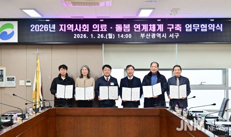 제이앤엠뉴스 | 부산 서구는 지난 26일 ‘돌봄통합지원법’ 시행에 맞춰, 의료·요양·돌봄 통합지원기반을 조성하고자 ∆동아대학교대신병원(병원장 김기림), ∆바른병원(병원장 강정한), ∆선하요양병원(이사장 허방), ∆송도요양병원(이사장 정하용), ∆이의용밝은길요양병원(병원장 이의용)과 업무협약(MOU)을 체결했다.