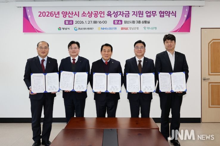 제이앤엠뉴스 | 양산시는 27일 NH농협은행, BNK경남은행, 하나은행 및 경남신용보증재단과 ‘양산시 소상공인 육성자금 지원사업’ 업무협약을 체결하고 소상공인 보증 지원 사업을 시행한다고 밝혔다.