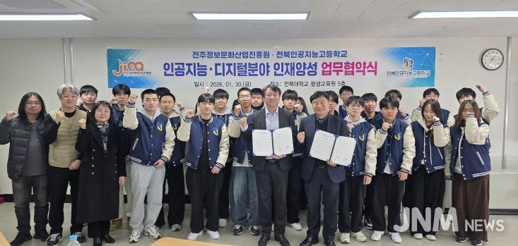 (재)전주정보문화산업진흥원(이하 진흥원)은 30일 전북대학교 평생교육원에서 전북인공지능고등학교(이하 전북인공지능고)와 인공지능·디지털 분야 인재 양성 및 지역 산업·교육 발전을 위한 업무협약을 체결했다.