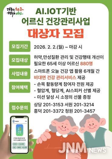 제이앤엠뉴스 | 청주시 보건소는 2월 2일부터 65세 이상 어르신을 대상으로 하는 인공지능(AI)·사물인터넷(IoT) 기반 어르신 건강관리사업 참여자 880명을 모집한다.