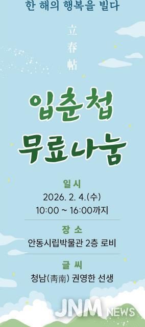 제이앤엠뉴스 | 안동시립박물관은 2026년 입춘을 맞아, 박물관을 찾는 관람객들을 대상으로 ‘입춘첩(立春帖)’ 무료 나눔 행사를 2월 4일 오전 10시부터 오후 4시까지 진행한다.