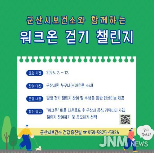 제이앤엠뉴스 | 군산시보건소가 모바일 걷기 앱 ‘워크온(WalkOn)’을 활용한 월별 걷기 챌린지를 2월부터 12월까지 운영할 예정이라고 밝혔다.