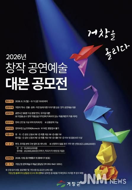 제이앤엠뉴스 | 거창군은 거창의 이야기와 정체성을 담은 공연콘텐츠 발굴을 위해 2026년 창작 공연예술 대본 공모전, ‘거창을 올리다’를 개최한다고 4일 밝혔다.