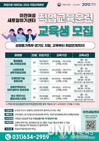 제이앤엠뉴스 | 이천여성새로일하기센터는 경력 단절 여성의 직업능력 개발과 취·창업 연계를 위해 2026년 직업교육훈련 교육생을 모집한다.