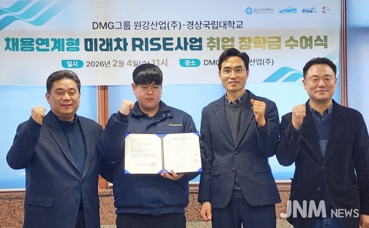 제이앤엠뉴스 | 경상국립대학교는 2월 4일 오전 11시 함안군에 소재한 원강산업(주) 회의실에서 ‘채용연계형 미래차 RISE사업 취업 장학금 수여식’을 개최했다.