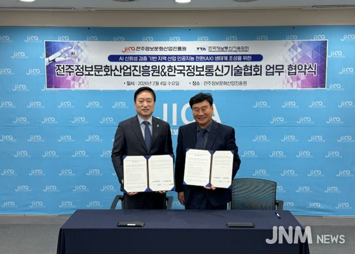 제이앤엠뉴스 | 전주시 출연기관인 전주정보문화산업진흥원은 4일 진흥원 멀티미디어기술지원센터 1층 세미나실에서 한국정보통신기술협회와 AI 신뢰성 검증 기반 지역 산업 인공지능 디지털 전환(AX) 생태계 조성을 위한 업무협약을 체결했다.