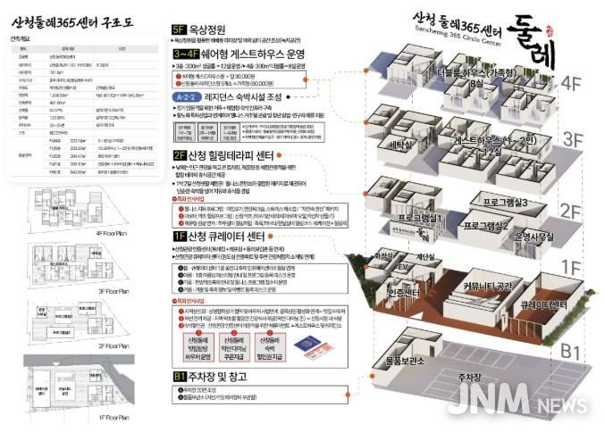 첫째, 산청읍 옥산리 163-1번지 일원에 총116억원을 투입, 지하1층 지상4층 규모로 편안한 둘레 체류공간을 위해 문화융복합 체류형 거점인 산청둘레 365센터가 조성되며, 거점연계 공간을 위해 리셉션광장과 공가를 활용한 레지던스 숙박시설을 조성하여 우리군을 찾는 관광객이 머물수 있는 공간으로 활용할 예정이다.