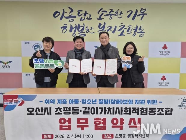 제이앤엠뉴스 | 오산시 초평동 행정복지센터는 지난 4일 지역 내 차상위계층 청소년과 아동의 건강한 성장 지원과 의료비 부담 완화를 위해 같이가치사회적협동조합과 질병(상해)보험료 지원을 위한 업무협약을 체결했다고 밝혔다.