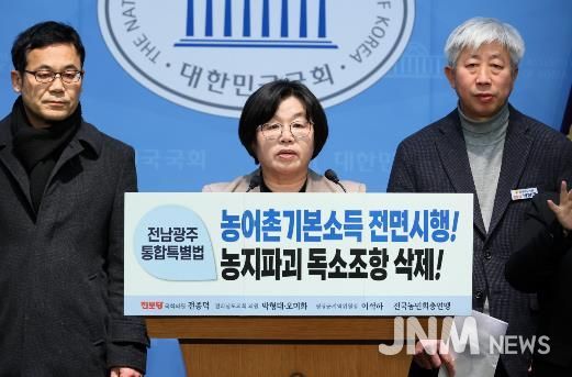 제이앤엠뉴스 | 전라남도의회 오미화 의원(진보당ㆍ영광2)은 지난 3일, 국회 소통관에서 전남ㆍ광주 통합 특별법과 관련해 농지파괴가 우려되는 조항의 삭제와 농어촌기본소득 전면 시행을 요구하는 기자회견을 열었다.