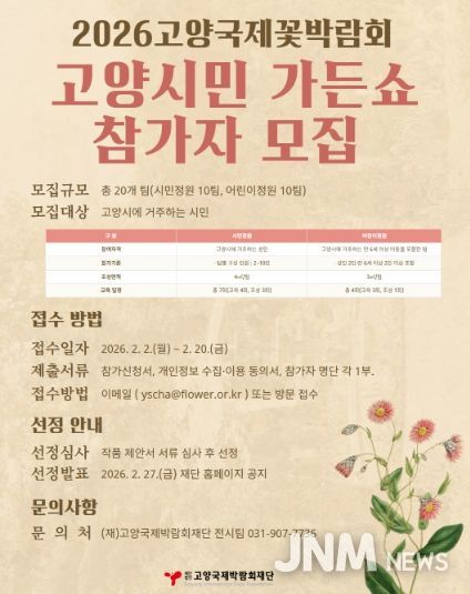 제이앤엠뉴스 | (재)고양국제박람회재단이 오는 4월 24일 일산호수공원에서 개최되는 2026고양국제꽃박람회의 시민 참여 프로그램 ‘고양시민 가든쇼’의 참가자를 이달 20일까지 모집한다.
