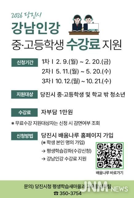 제이앤엠뉴스 | 당진시는 사교육비로 인한 부모들의 경제적 부담 덜기 위해 당진시 중고등학생과 학교 밖 청소년을 대상으로 ‘강남인강’ 수강료를 지원한다고 6일 밝혔다.