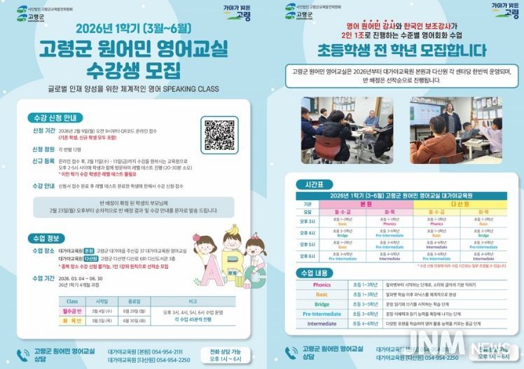 제이앤엠뉴스 | 사)고령군교육발전위원회(이사장 성현덕)는 고령군 초등학생을 대상으로 영어 의사소통 능력 향상과 국제적 감각 함양을 위해 ‘2026년 고령군 원어민 영어교실’ 1학기 과정을 운영한다.