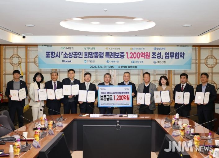 제이앤엠뉴스 | 포항시는 자금 조달에 어려움을 겪는 소상공인을 지원하기 위해 6일 경북신용보증재단 및 협약 금융기관과 총 1,200억 원 규모의 ‘희망동행 특례보증재원’ 조성을 위한 업무협약(MOU)을 체결했다.