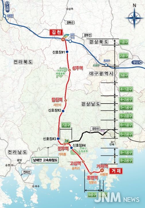 남부내륙철도는 경북 김천에서 경남 거제까지 총연장 174.6km구간에 총사업비 7조 974억 원이 투입되는 국가 기간 철도망 구축 사업이다. 2031년 개통을 목표로 하며, 완공 시 고속열차(KTX·SRT)가 김천역을 거쳐 거제까지, 또 진주역에서 마산역까지 운행하는 노선이 구축된다.
