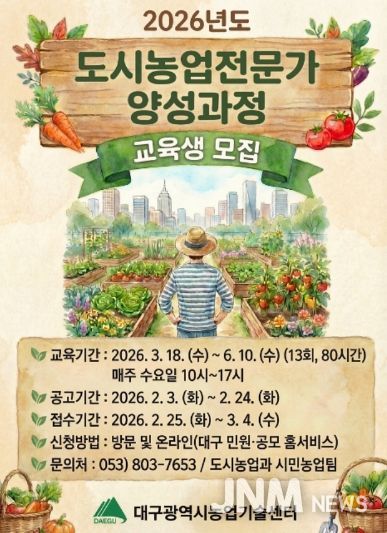 제이앤엠뉴스 | 대구광역시농업기술센터는 단순한 농사 기술 습득을 넘어 도시 생태계 보전과 정서 함양 등 도시농업을 선도할 시민을 대상으로 ‘2026년도 도시농업전문가 양성과정’을 운영한다.