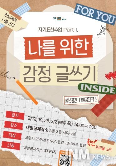 제이앤엠뉴스 | 고양특례시는 오는 2월 12일부터 매주 목요일 4주간, 고양시 청년공간‘내일꿈제작소’에서 관내 청년들의 마음돌봄을 위한‘감정글쓰기’프로그램을 진행한다고 밝혔다.