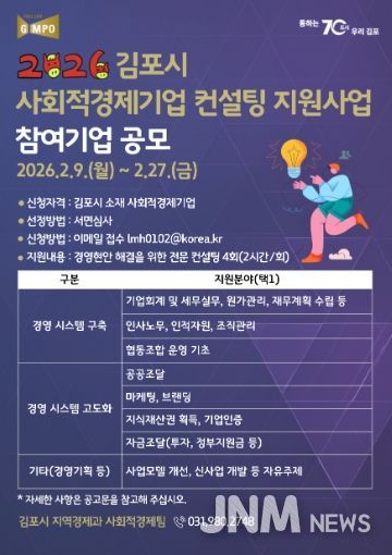 제이앤엠뉴스 | 김포시가 관내 사회적경제기업의 지속 가능한 성장과 자생력 강화를 위해 ‘사회적경제기업 역량강화 컨설팅 지원사업’ 참여기업을 오는 2월 27일까지 모집한다.