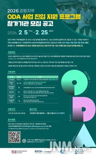 제이앤엠뉴스 | 강원특별자치도와 강원국제개발협력센터는 도내 기업 및 기관의 해외시장 개척과 글로벌 경쟁력 강화를 위해 2월 5일부터 25일까지 '2026 강원지역 ODA 사업 진입 지원 공모사업' 참여기관을 모집한다.