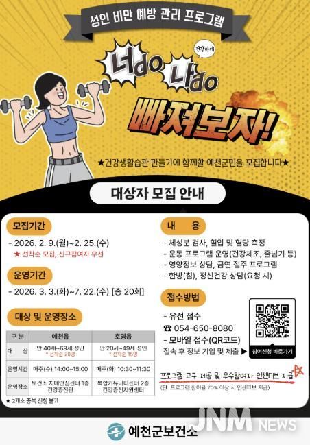 제이앤엠뉴스 | 예천군은 성인 비만 예방과 건강한 생활 습관 형성을 위해 ‘2026년 성인 비만 예방 관리 프로그램’ 참여 대상자를 9일부터 25일까지 선착순으로 모집한다.
