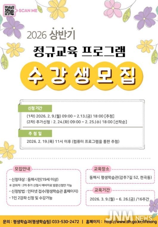 제이앤엠뉴스 | 동해시는 지속 가능한 평생학습 환경 조성을 통해 시민의 삶의 질 을 높이기 위해, 동해시민을 대상으로‘2026년 동해시 평생학습관 상반기 정규교육’수강생을 모집한다고 밝혔다.