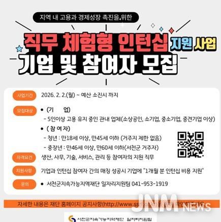 한편, 직무 체험형 인턴십 지원사업과 관련된 자세한 사항은 서천군지속가능지역재단 홈페이지를 통해 확인할 수 있다.