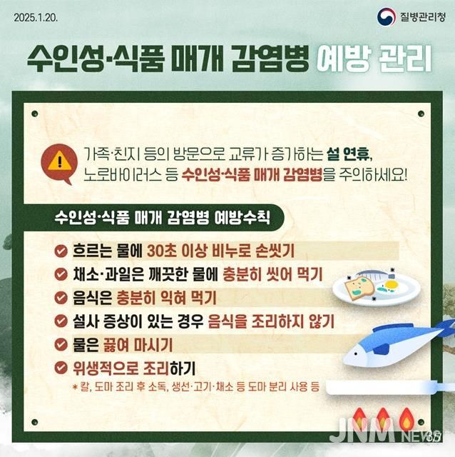 겨울철에 주로 발생하는 노로바이러스 감염증이 최근 영유아(0~6세)와 학생을 중심으로 지속적으로 발생하고 있어 각별한 주의가 요구된다. 노로바이러스는 오염된 음식물뿐만 아니라 환자와의 접촉, 비말 등을 통해서도 전파될 수 있어 많은 사람이 모이는 명절에 확산 위험이 더 높아진다. 파주보건소는 관내 어린이집, 사회복지시설 등 감염 취약시설에 예방수칙 안내문을 배포하고, 위생 관리를 철저히 해줄 것을 당부했다.