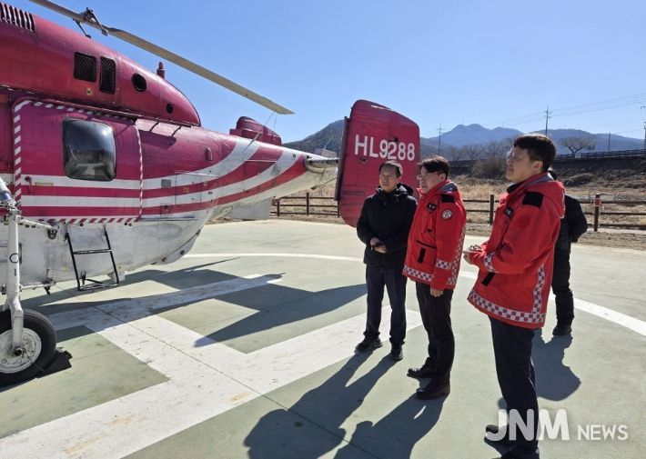 제이앤엠뉴스 | 경남 밀양시는 산불재난 국가위기경보가 ‘경계’ 단계로 격상됨에 따라, 지난 9일 무안면에 위치한 임차헬기 계류장을 방문해 산불 대응 역량을 집중 점검했다.