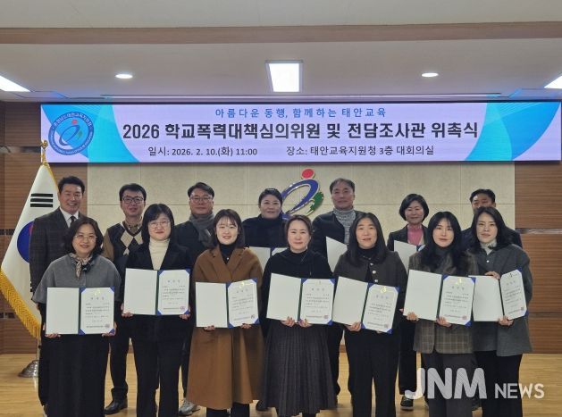 제이앤엠뉴스 | 충청남도태안교육지원청(교육장 지재규)은 10일(화), 태안교육지원청 대회의실에서 ‘2026-2027학년도 학교폭력대책심의위원회 위원 및 2026학년도 학교폭력 전담조사관 위촉식’을 개최했다.