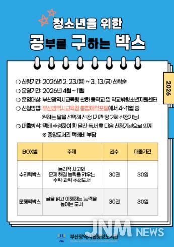 제이앤엠뉴스 | 부산광역시립중앙도서관은 청소년의 문해력과 수리력 향상을 돕기 위한 도서 단체 대출 서비스인 ‘청소년을 위한 공·구박스(공부를 구하는 박스)’를 운영한다.