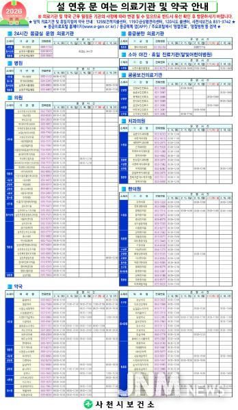 사천시보건소 관계자는 “설 명절 동안 시민들이 안심하고 연휴를 즐길 수 있도록 비상진료체계 유지에 만전을 기하고 있다”며, “의료 이용에 불편함이 없도록 행정적 지원을 아끼지 않겠다” 고 말했다.