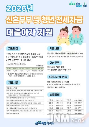 제이앤엠뉴스 | 전북특별자치도는 도민들의 주거비 부담을 완화하고 안정적인 정착을 지원하기 위해 저소득층 대상 임대보증금 무이자 융자, 신혼부부와 청년을 위한 전세자금 대출이자 지원, 공공임대주택 보증금 지원 등 '주거비 지원 3종 세트'를 올해부터 대폭 확대 시행한다고 12일 밝혔다.