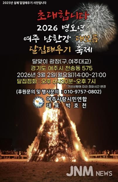 제이앤엠뉴스 | 여주시는 여주사랑시민연합 주관으로 오는 3월 2일 오후 2시 달맞이 광장(연인교 아래/경기도 여주시 천송동 575)에서 정월대보름을 맞아 전통 세시풍속 행사인 ‘달집태우기’ 행사를 개최한다고 밝혔다.