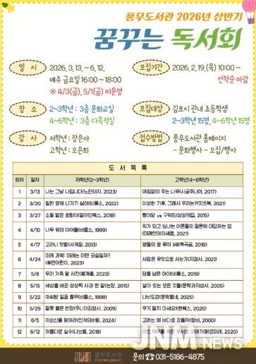 제이앤엠뉴스 | 김포시 풍무도서관은 오는 3월 13일부터 6월 12일까지 매주 금요일 총 12회에 걸쳐 2026년 상반기 ‘꿈꾸는 독서회’를 운영한다.