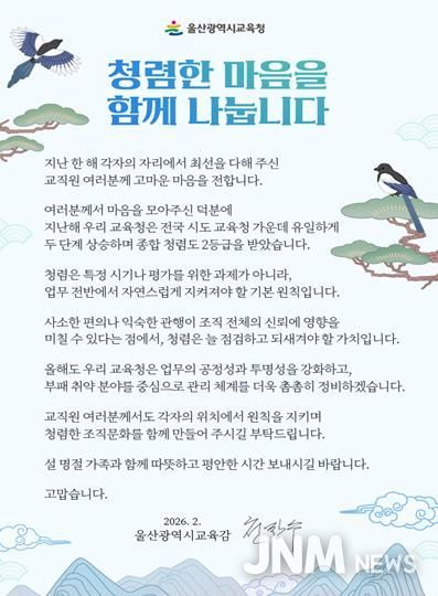 제이앤엠뉴스 | 울산광역시교육청은 설 명절을 앞둔 12일 울산 지역 전 교육기관과 학교 교직원에게 청렴 의지를 다지는 ‘청렴 서한문’을 보냈다.