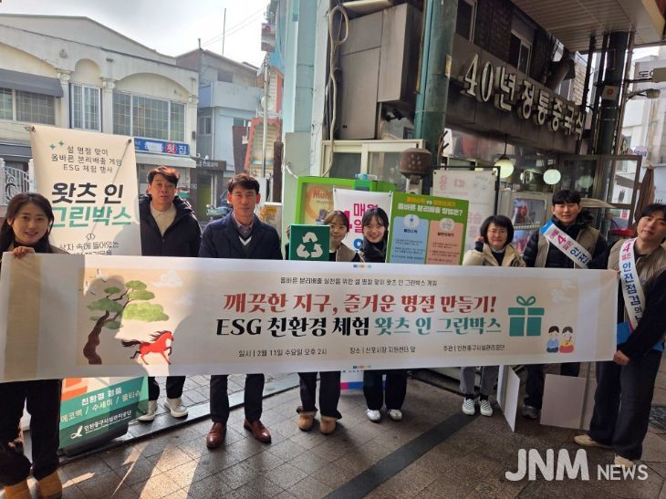 제이앤엠뉴스 | 인천중구시설관리공단은 공단 임직원들이 설을 앞두고 지난 11일 신포국제시장에서 지역 주민들을 대상으로 생활 속 올바른 분리배출 실천을 유도하기 위한 체험형 친환경 행사 ‘왓츠 인 그린박스’를 진행했다고 밝혔다.