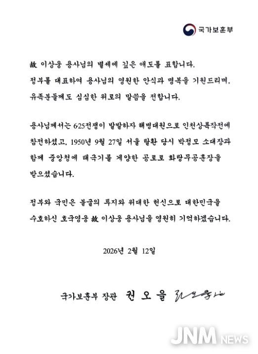 제이앤엠뉴스 | 6‧25전쟁이 한창이던 1950년 9월, 아군의 서울수복 당시 박정모 소대장과 함께 중앙청에 태극기를 게양했던 이상웅 참전용사가 별세함에 따라 권오을 국가보훈부 장관이 13일 조전을 보내 “호국영웅을 영원히 기억하겠다”며 고인의 명복을 빌었다.
