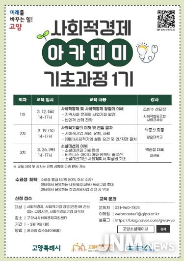 제이앤엠뉴스 | 고양산업진흥원 고양시사회적경제지원센터가 오는 3월 9일까지 ‘2026년 고양시 사회적경제 아카데미 기초과정 1기’수강생을 모집한다.