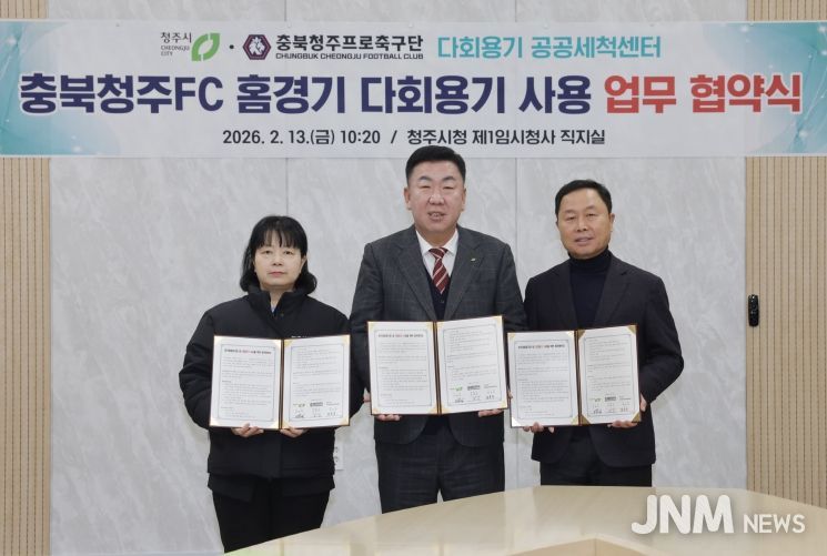 제이앤엠뉴스 | 청주시는 13일 충북청주 프로축구단(충북청주FC), 다회용기 공공세척센터와 함께 충북FC 홈경기 다회용기 사용 확대를 위한 업무협약을 체결했다.