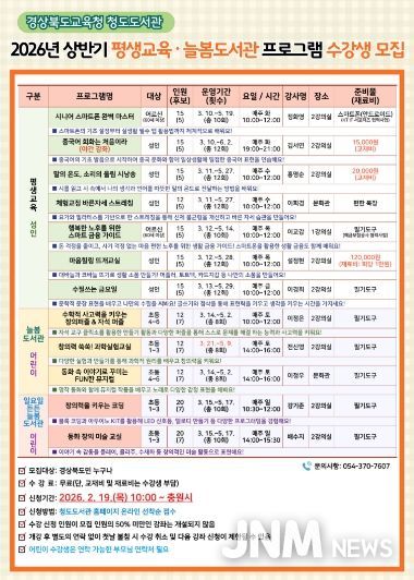 제이앤엠뉴스 | 경상북도교육청 청도도서관(관장 조은희)은 2월 19일부터 지역주민을 대상으로 2026년 상반기 평생교육 및 늘봄도서관 프로그램 수강생을 모집한다.