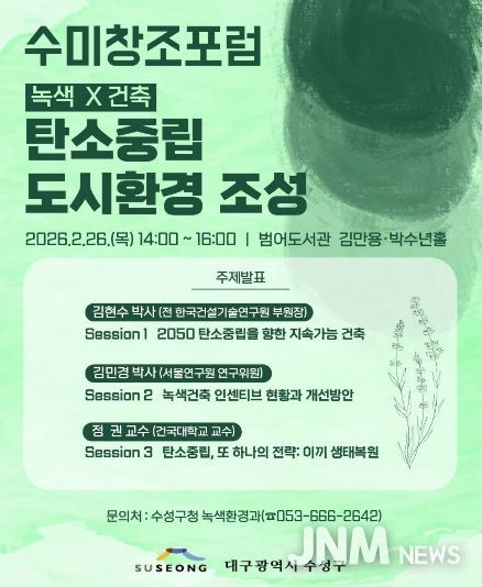 제이앤엠뉴스 | 대구 수성구는 이달 26일 ‘녹색×건축: 탄소중립 도시환경 조성’을 주제로 범어도서관 김만용·박수년홀에서 ‘수미창조 포럼’을 개최한다고 밝혔다.