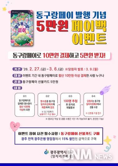 제이앤엠뉴스 | 광주 동구는 지역상권 활성화와 소비 촉진을 위해 동구 지역사랑상품권 ‘광주 동구랑페이’ 발행을 기념한 5만 원 페이백 이벤트를 추진한다고 밝혔다.