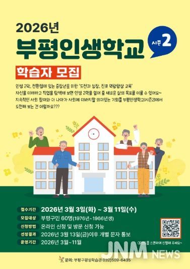 구 관계자는 “부평인생학교(시즌2)는 중·장년 학습자가 경력 전환을 준비하고, 변화하는 사회 속에서 의미 있는 삶을 설계하도록 돕는 데 중점을 두고 있다”며 “인생 2막을 준비하는 구민들의 많은 참여를 바란다”고 말했다.