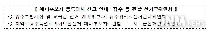 제이앤엠뉴스 | 중앙선거관리위원회는 '전남광주통합특별시 설치를 위한 특별법' 공포에 따라 전남과 광주 지역의 시·도지사, 교육감, 지역구 시·도의회의원 선거 예비후보자들이 3월 16일까지 관할 선거구위원회에 서면으로 등록 의사를 제출해야 한다고 안내했다.