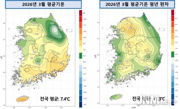 제이앤엠뉴스 | 기상청은 2026년 3월 전국 평균기온이 7.4℃로 평년보다 1.3℃ 높았다고 밝혔다. 이로써 2018년 이후 9년 연속 3월 기온이 평년을 웃돌며 뚜렷한 온난화 현상이 이어지고 있다.